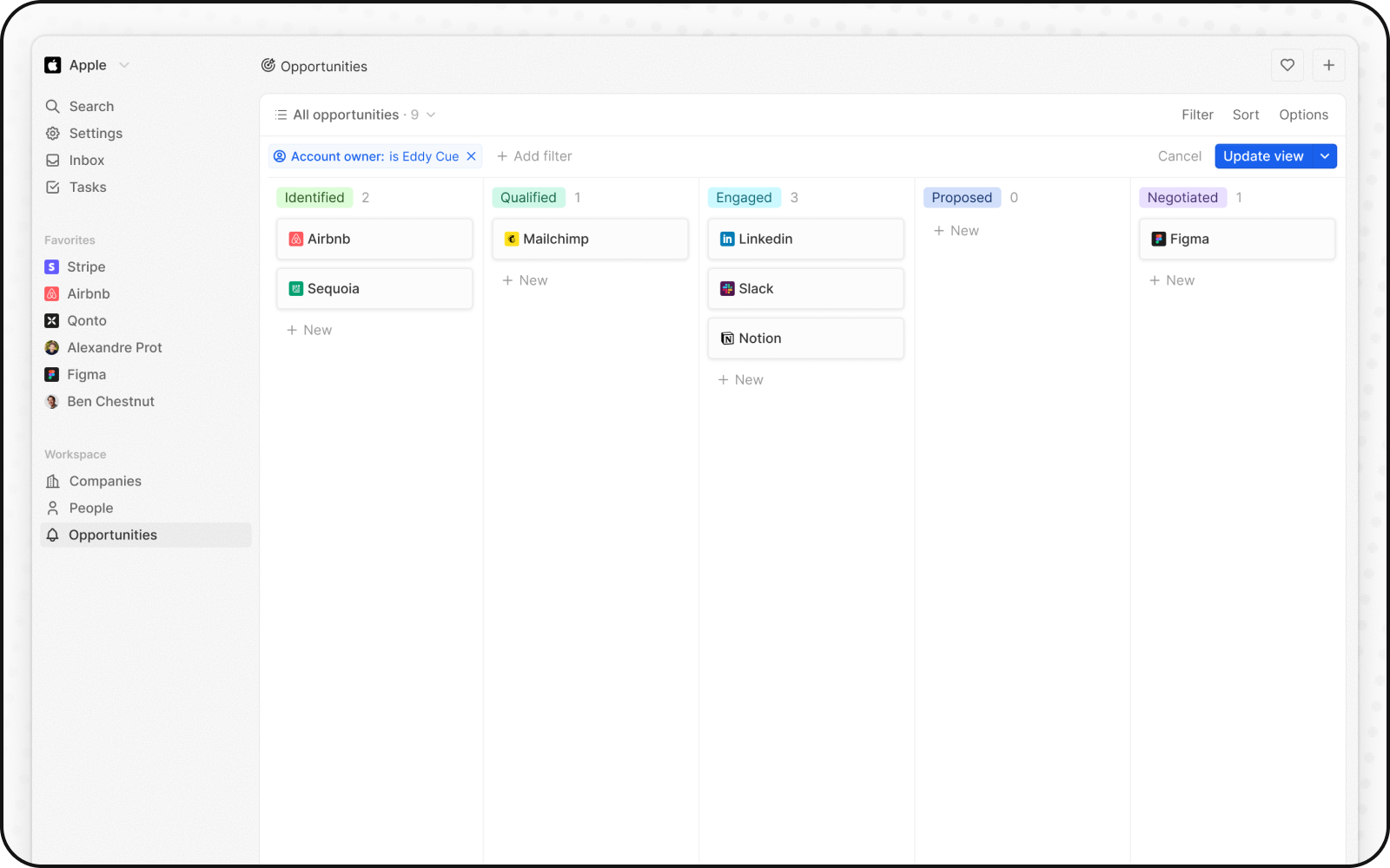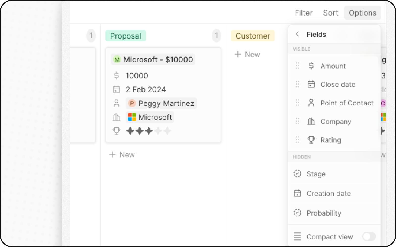 You can also hide all the fields, and get an overview of all the opportunities at a glance. To do so, click on Options on the top right and turn on the toggle in front of the Compact view option.
