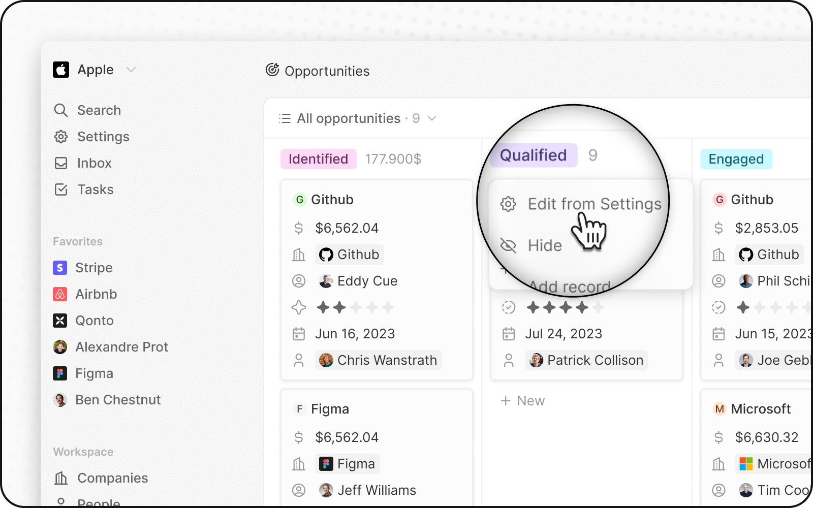 To remove a stage, hover the stage name or the ⋮ icon, click Edit from settings in the Select Field settings, and then click Delete next to the relevant stage.